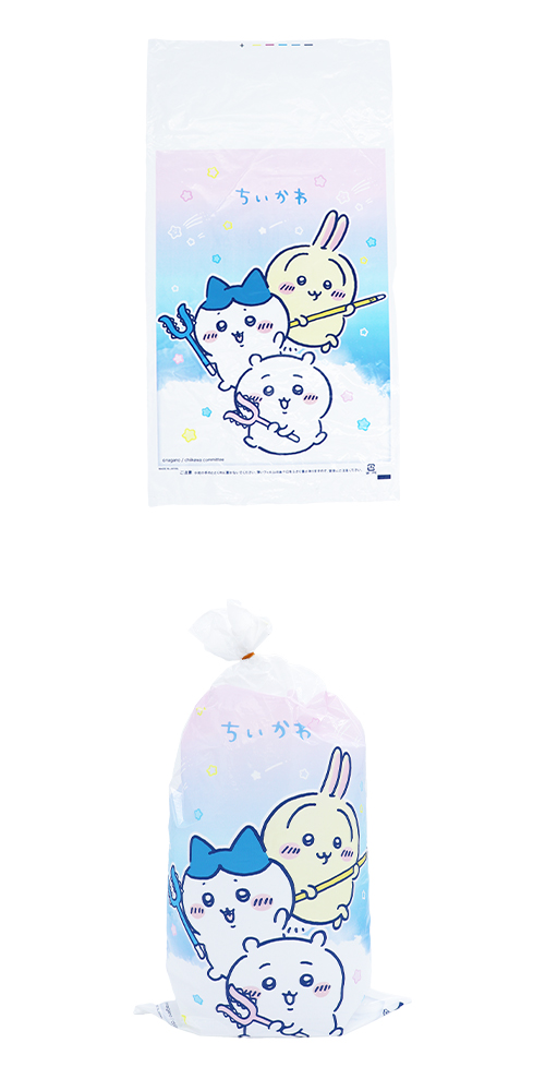 縦約53×横約28cm「ちいかわ」フジテレビ系列「めざましテレビ」内にて毎週火・金7:40ごろ放送中!メインキャラクターのちいかわ、ハチワレ、うさぎの揃ったデザインです。ちいかわの綿アメ袋が登場!
