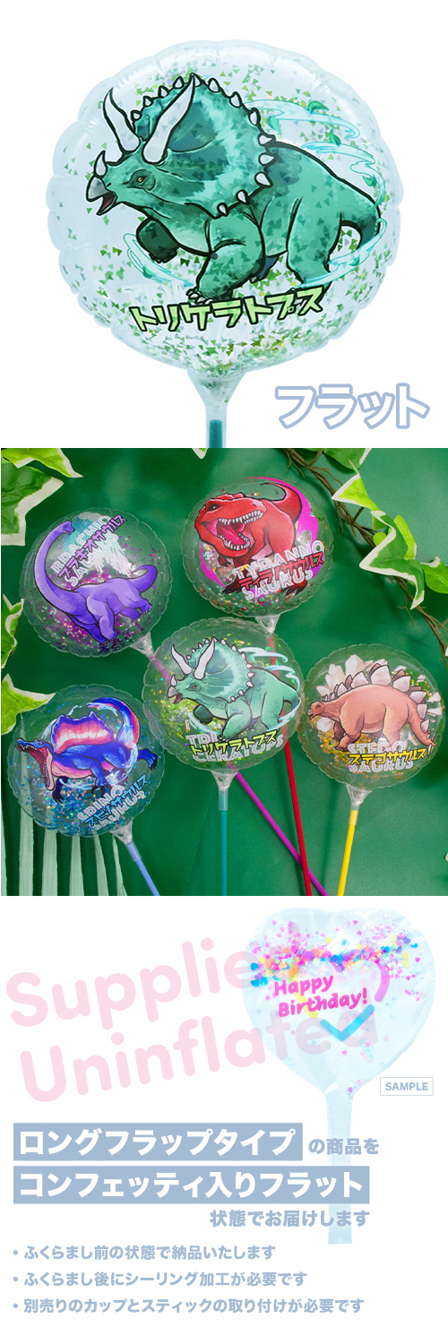 130mmラウンド 膨らまし&カラーファイバースティック取り付け後サイズ:W11×H37.5×D7cmキッシーズオリジナルデザインのフィルムバルーンです。輝く緑とシルバーのコンフェッティが草原を堂々と歩くトリケラトプスのイラストにぴったり。頭のフリルが魅力的! ※コンフェッティ入りのフラット状態でお届けいたします。画像は吹き後イメージです。 ※クリア生地・片面印刷となります。 ※カップ・スティックは付属しません。 マルチタイニーカップ+25cmカラーファイバースティックの併用がおすすめです。 #男の子 #ダイナソー |