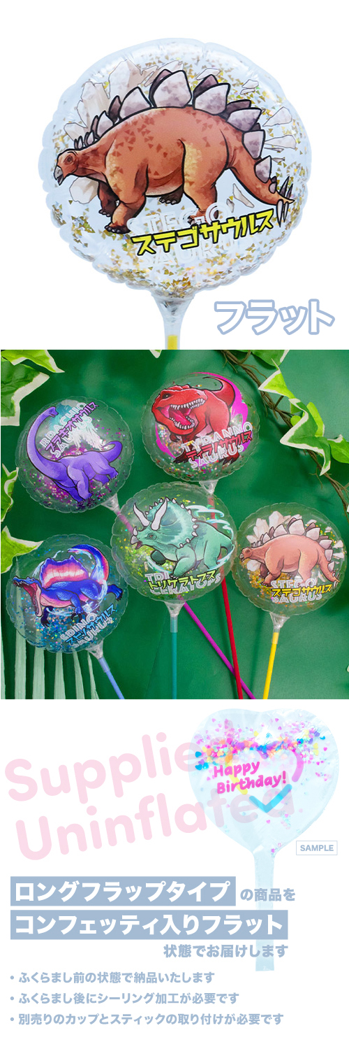130mmラウンド 膨らまし&カラーファイバースティック取り付け後サイズ:W11×H37.5×D7cmキッシーズオリジナルデザインのフィルムバルーンです。丸いバルーンにトゲトゲのステゴサウルス!コンフェッティもゴールドとシルバーの三角形でトゲトゲ&キラキラです。 ※コンフェッティ入りのフラット状態でお届けいたします。画像は吹き後イメージです。 ※クリア生地・片面印刷となります。 ※カップ・スティックは付属しません。 マルチタイニーカップ+25cmカラーファイバースティックの併用がおすすめです。 #男の子 #ダイナソー |