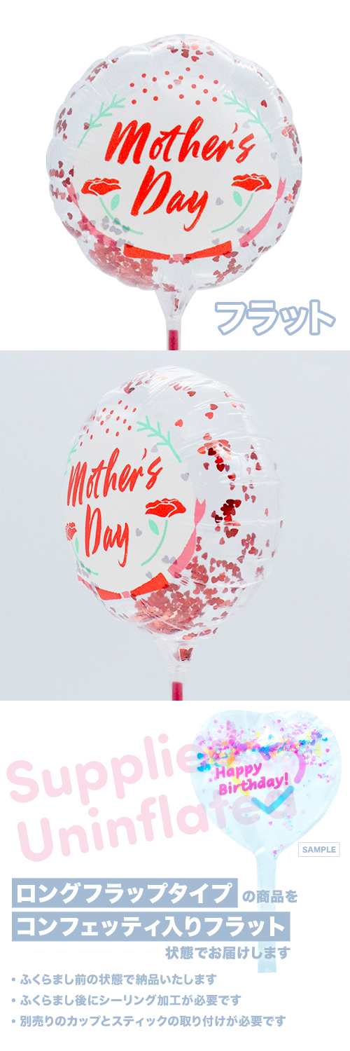 ※コンフェッティ入りのフラット状態でお届けいたします。画像は吹き後イメージです。 ※クリア生地・片面印刷となります。 ※カップ・スティックは付属しません。 マルチタイニーカップ+25cmカラーファイバースティックの併用がおすすめです。 #母の日 |