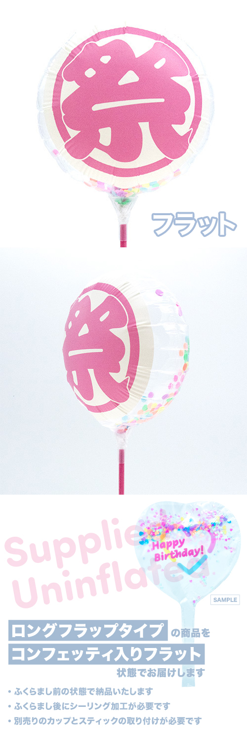 ※コンフェッティ入りのフラット状態でお届けいたします。画像は吹き後イメージです。 ※クリア生地・片面印刷となります。 ※カップ・スティックは付属しません。 マルチタイニーカップ+25cmカラーファイバースティックの併用がおすすめです。 |