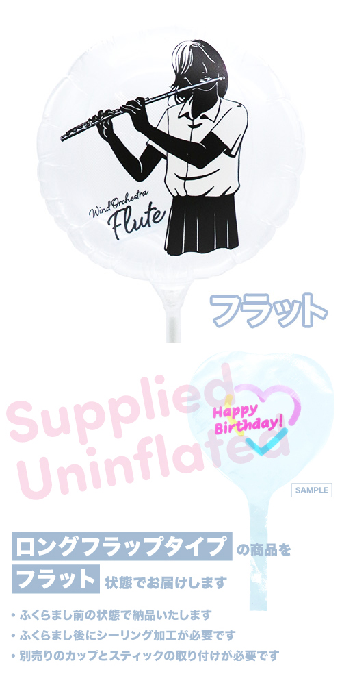 130mmラウンド 膨らまし&カラーファイバースティック取り付け後サイズ:W11×H37.5×D7cmキッシーズオリジナルデザインのフィルムバルーンです。文化部で大人気 "吹奏楽" のデザインが登場!美しい音色を奏でる "フルート" のデザインです。
