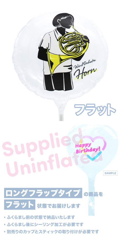 130mmラウンド 膨らまし&カラーファイバースティック取り付け後サイズ:W11×H37.5×D7cmキッシーズオリジナルデザインのフィルムバルーンです。文化部で大人気 "吹奏楽" のデザインが登場!吹奏楽ではかなり高難易度!?"ホルン" のデザインです。