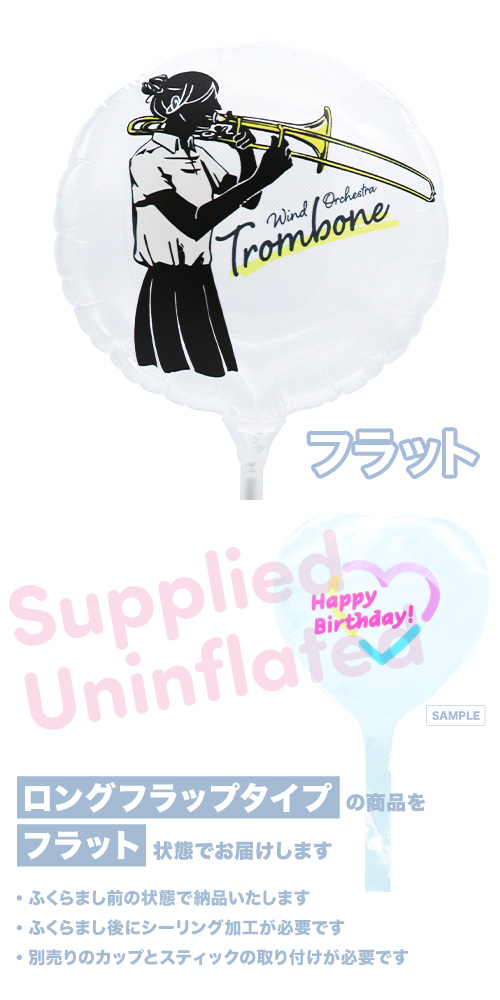 130mmラウンド 膨らまし&カラーファイバースティック取り付け後サイズ:W11×H37.5×D7cmキッシーズオリジナルデザインのフィルムバルーンです。文化部で大人気 "吹奏楽" のデザインが登場!アンサンブルを支える "トロンボーン" のデザインです。