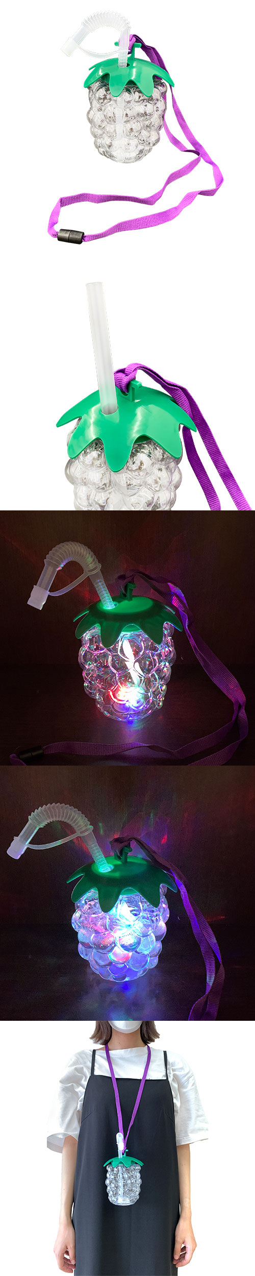 ボトルサイズ:W約7.5×H11cm ストロー長さ約21cm ストラップ長さ約50cm 容量420mlぶどう型のジュースボトルです!ストラップ付なので、首から下げて持ち歩くことができます。底のボタンを押すと綺麗に光ります。3パターンの光。