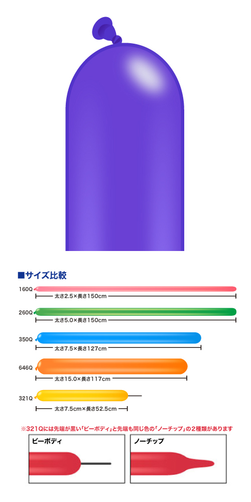 アイテム説明 世界中のプロフェッショナルに愛用される高品質ゴム風船です。 ゴム質・発色の良さ、サイズ・種類の豊富さは他の追随を許しません。 デコレーションやパフォーマンスなど実際にご利用いただきますと、圧倒的な品質の差を実感出来ます。 350Qは一般的なサイズ260Qに比べ太さが7.5cmと太くなっています。その分全長が約23cm程短くもなっています。 その特徴を生かして柱の様な演出、例えば植物の茎を表現したり、キャラクターの胴体部分に使ったり、筋肉質な腕や足を表現するなど太さを利用したアレンジが楽しめます。 160Q、260Qや646Qなど太さの違う商品と組み合わせることで立体感や作品の幅が飛躍的に広がります。 ゴム風船は100%天然ゴムを使用し作られております。 日光や水によって分解され自然にかえる環境にやさしい素材となっています。 アイテム詳細 袋入り数:100個入 膨らませ後サイズ:太さ7.5cm 長さ127cm やや太めのサイズ感です。 ヘリウムガス:非対応 おすすめ商品 646Q(太さ15.5cm 長さ117cm) > その他サイズもございます。 【キャンペーン実施中】 対象のキャンペーンでポイントが加算されます! 例えば 通常ポイントが時間帯によってポイントが加算! 協賛のイベント、新商品入荷などでポイントが加算! 圧倒的なラインナップと在庫を誇るキッシーズのポイントアップキャンペーンをご利用ください! 商品のお問い合わせの際は品番をお伝えください。