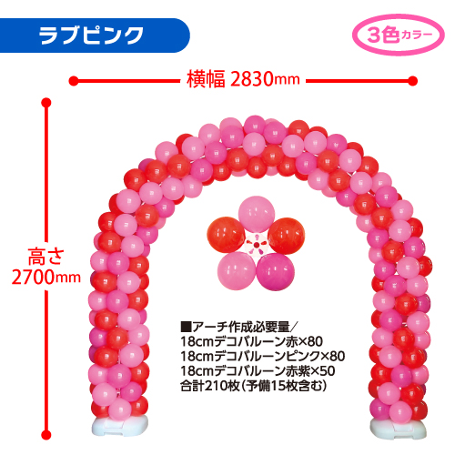 組立サイズ:283cmx270cm デコバルーンアーチキット内容 ・アルミアーチフレーム(高さ2450mm・横幅2350mm) ・プラムS×43枚 ・連結接続ネジ×7本 ・ベーススタンド(水重り)×2台 ・18cmデコバルーン各色×合計210枚(予備15枚含む) ・2WEYポンプ×1 ・サイザー型紙×1 ・ドライバー×1 ※別途エアーコンプレッサーのご利用をお薦めします。