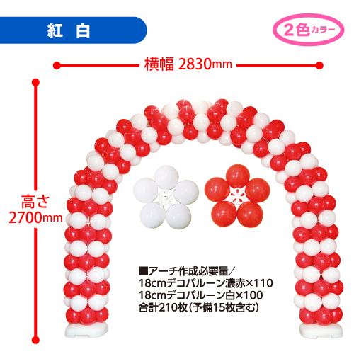 組立サイズ:283cmx270cm デコバルーンアーチキット内容 ・アルミアーチフレーム(高さ2450mm・横幅2350mm) ・プラムS×43枚 ・連結接続ネジ×7本 ・ベーススタンド(水重り)×2台 ・18cmデコバルーン各色×合計210枚(予備15枚含む) ・2WEYポンプ×1 ・サイザー型紙×1 ・ドライバー×1 ※別途エアーコンプレッサーのご利用をお薦めします。