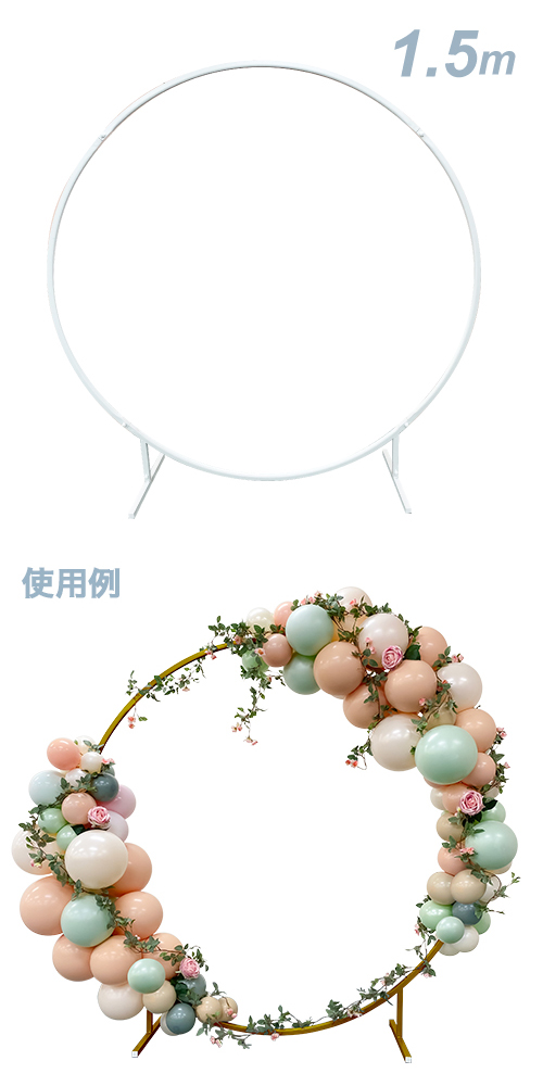 サイズ:1.5m ゴム風船を取り付ける際は、クラスターにして取り付けたり、バルーンテープをご利用して取り付けて下さい。 材質:鉄 輪っか(丸型)形状のフレーム。4分割の(土台の2パーツ除く)組み立て式でコンパクト。通常はT字のフレームで足場を装着しますが、別売のスクエアベース差し替えのご利用も可能です。フレームにバルーンをすべて取り付けなくてもフレームのラインがデザインにもなります。
