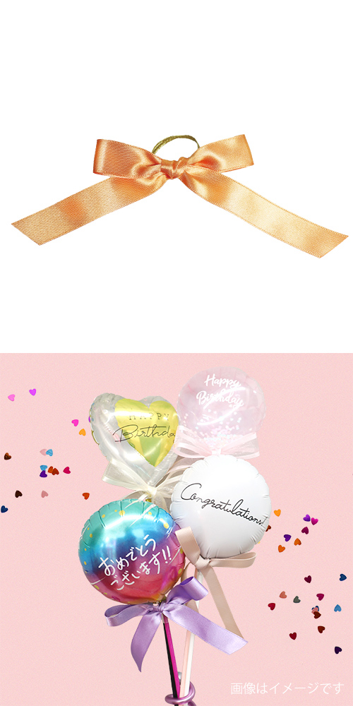 リボン幅18mm 全体ボウサイズ:およそW15cm×H8〜10cm素材:ポリエステル(サテンタイプ)4インチサイズもしくは80mmサイズのスティックバルーンへ取り付けてご利用ください。輪ゴム付きなのでカップに巻きつけて取り付けます(動画参照)