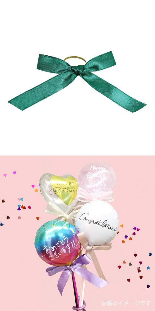 リボン幅18mm 全体ボウサイズ:およそW15cm×H8〜10cm素材:ポリエステル(サテンタイプ)4インチサイズもしくは80mmサイズのスティックバルーンへ取り付けてご利用ください。輪ゴム付きなのでカップに巻きつけて取り付けます(動画参照)