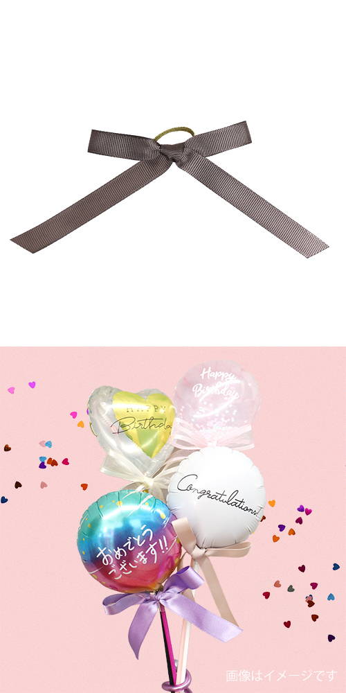 リボン幅13mm 全体ボウサイズ:およそW15cm×H8〜10cm素材:ポリエステル(グログランタイプ:表面に筋加工あり)4インチサイズもしくは80mmサイズのスティックバルーンへ取り付けてご利用ください。輪ゴム付きなのでカップに巻きつけて取り付けます(動画参照)