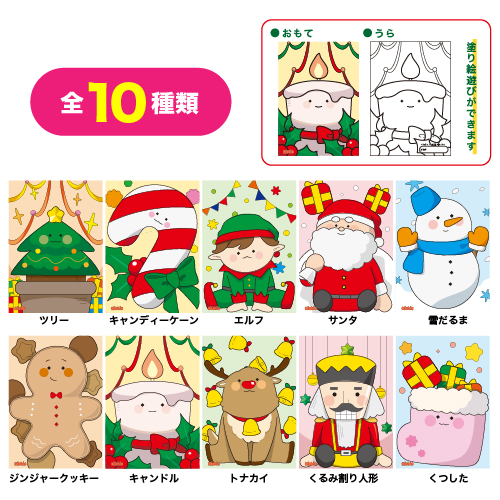サイズ:162×229mm、玩具入、クリップ付きイベント用釣竿 LBREV21136などのマグネット付きの釣竿を使って、釣り遊びができるクリスマス柄のバッグです。中には低単価玩具が入っており、中身が分からないドキドキ感が楽しめます。また、裏面が塗り絵となっているので、釣った後にも二度楽しめます。