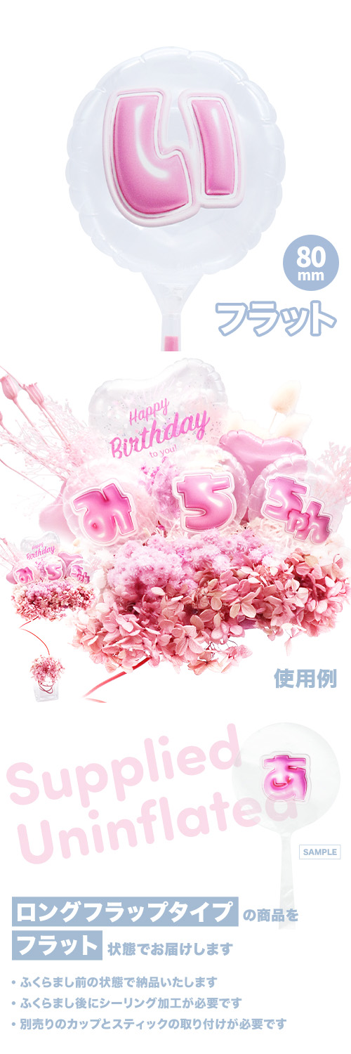 80mmラウンド 膨らまし後サイズ:W6.5×H6.5×D4cm カラーファイバースティック25cm取り付け後サイズ:W6.5×H32.8×D4cm前代未聞!キッシーズオリジナルの日本語レターバルーンです。 クリア生地にぷっくり可愛いひらがなを一文字ずつプリント。 複数の文字を組み合わせてご使用ください!