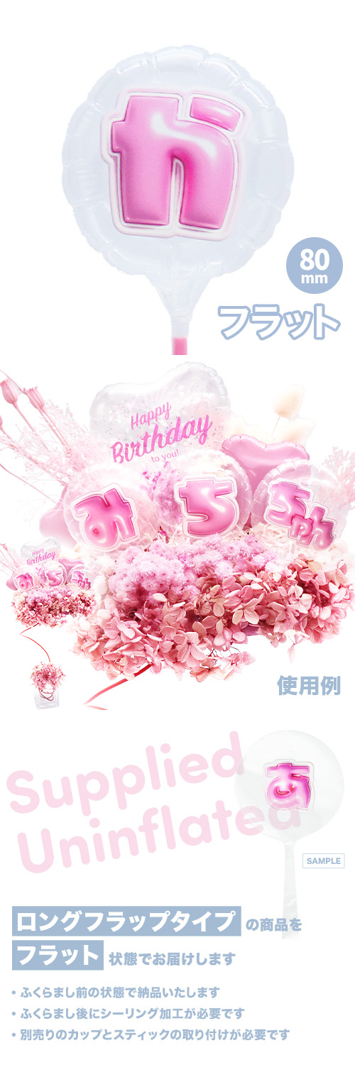80mmラウンド 膨らまし後サイズ:W6.5×H6.5×D4cm カラーファイバースティック25cm取り付け後サイズ:W6.5×H32.8×D4cm前代未聞!キッシーズオリジナルの日本語レターバルーンです。 クリア生地にぷっくり可愛いひらがなを一文字ずつプリント。 複数の文字を組み合わせてご使用ください!