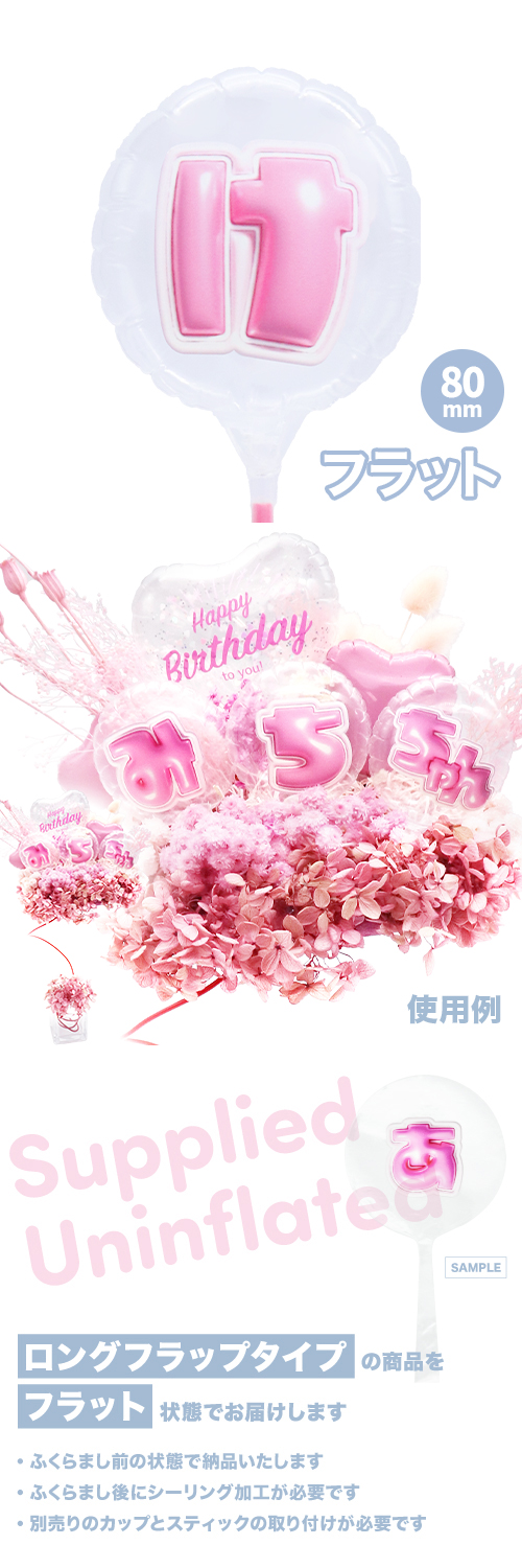 80mmラウンド 膨らまし後サイズ:W6.5×H6.5×D4cm カラーファイバースティック25cm取り付け後サイズ:W6.5×H32.8×D4cm前代未聞!キッシーズオリジナルの日本語レターバルーンです。 クリア生地にぷっくり可愛いひらがなを一文字ずつプリント。 複数の文字を組み合わせてご使用ください!