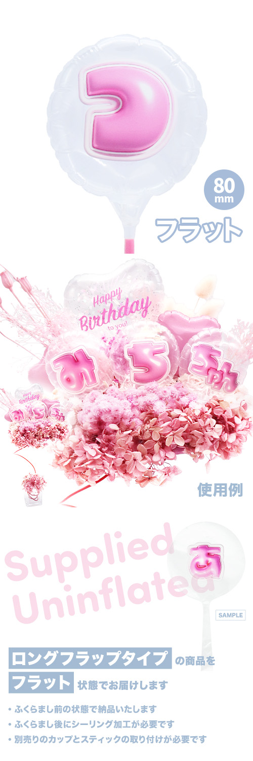 80mmラウンド 膨らまし後サイズ:W6.5×H6.5×D4cm カラーファイバースティック25cm取り付け後サイズ:W6.5×H32.8×D4cm前代未聞!キッシーズオリジナルの日本語レターバルーンです。 クリア生地にぷっくり可愛いひらがなを一文字ずつプリント。 複数の文字を組み合わせてご使用ください!