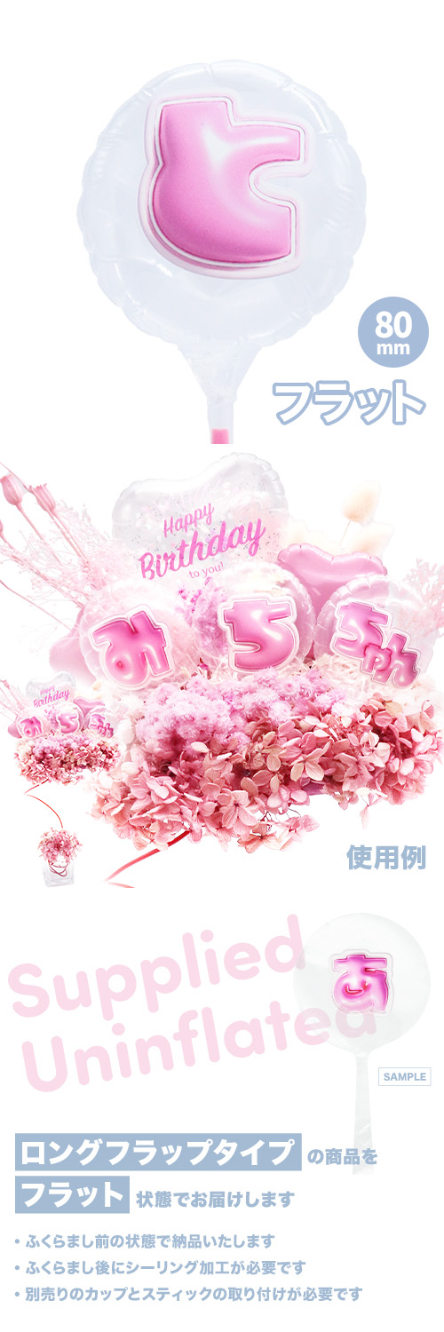 80mmラウンド 膨らまし後サイズ:W6.5×H6.5×D4cm カラーファイバースティック25cm取り付け後サイズ:W6.5×H32.8×D4cm前代未聞!キッシーズオリジナルの日本語レターバルーンです。 クリア生地にぷっくり可愛いひらがなを一文字ずつプリント。 複数の文字を組み合わせてご使用ください!