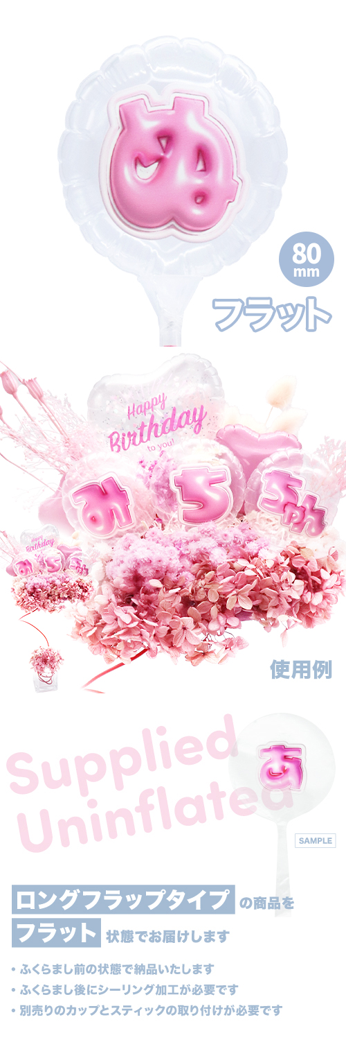 80mmラウンド 膨らまし後サイズ:W6.5×H6.5×D4cm カラーファイバースティック25cm取り付け後サイズ:W6.5×H32.8×D4cm前代未聞!キッシーズオリジナルの日本語レターバルーンです。 クリア生地にぷっくり可愛いひらがなを一文字ずつプリント。 複数の文字を組み合わせてご使用ください!
