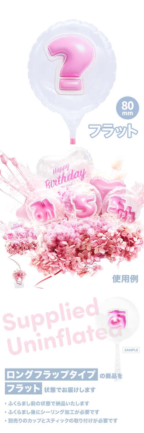 80mmラウンド 膨らまし後サイズ:W6.5×H6.5×D4cm カラーファイバースティック25cm取り付け後サイズ:W6.5×H32.8×D4cm前代未聞!キッシーズオリジナルの日本語レターバルーンです。 クリア生地にぷっくり可愛い「?」をプリント。 複数の文字を組み合わせてご使用ください!