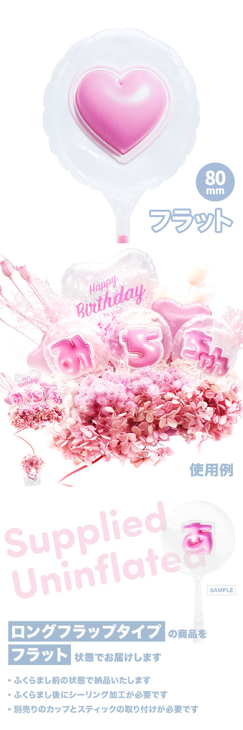 80mmラウンド 膨らまし後サイズ:W6.5×H6.5×D4cm カラーファイバースティック25cm取り付け後サイズ:W6.5×H32.8×D4cm前代未聞!キッシーズオリジナルの日本語レターバルーンです。 クリア生地にぷっくり可愛い「ハート」をプリント。 複数の文字を組み合わせてご使用ください!