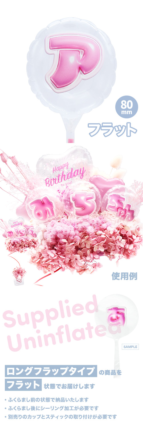80mmラウンド 膨らまし後サイズ:W6.5×H6.5×D4cm カラーファイバースティック25cm取り付け後サイズ:W6.5×H32.8×D4cm前代未聞!キッシーズオリジナルの日本語レターバルーンです。 クリア生地にぷっくり可愛いカタカナを一文字ずつプリント。 複数の文字を組み合わせてご使用ください!