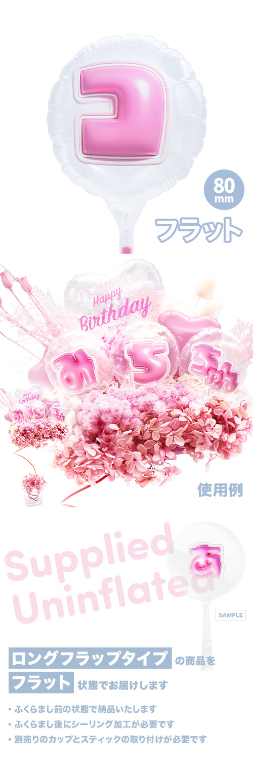 80mmラウンド 膨らまし後サイズ:W6.5×H6.5×D4cm カラーファイバースティック25cm取り付け後サイズ:W6.5×H32.8×D4cm前代未聞!キッシーズオリジナルの日本語レターバルーンです。 クリア生地にぷっくり可愛いカタカナを一文字ずつプリント。 複数の文字を組み合わせてご使用ください!