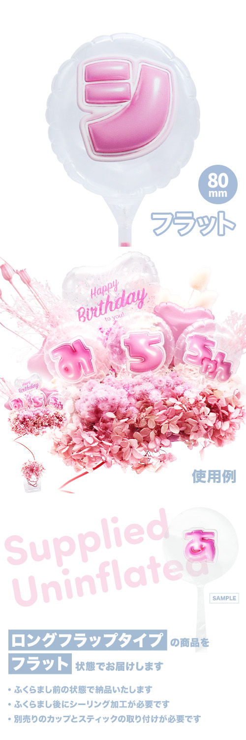 80mmラウンド 膨らまし後サイズ:W6.5×H6.5×D4cm カラーファイバースティック25cm取り付け後サイズ:W6.5×H32.8×D4cm前代未聞!キッシーズオリジナルの日本語レターバルーンです。 クリア生地にぷっくり可愛いカタカナを一文字ずつプリント。 複数の文字を組み合わせてご使用ください!