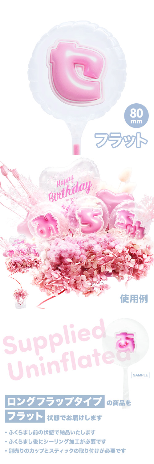 80mmラウンド 膨らまし後サイズ:W6.5×H6.5×D4cm カラーファイバースティック25cm取り付け後サイズ:W6.5×H32.8×D4cm前代未聞!キッシーズオリジナルの日本語レターバルーンです。 クリア生地にぷっくり可愛いカタカナを一文字ずつプリント。 複数の文字を組み合わせてご使用ください!