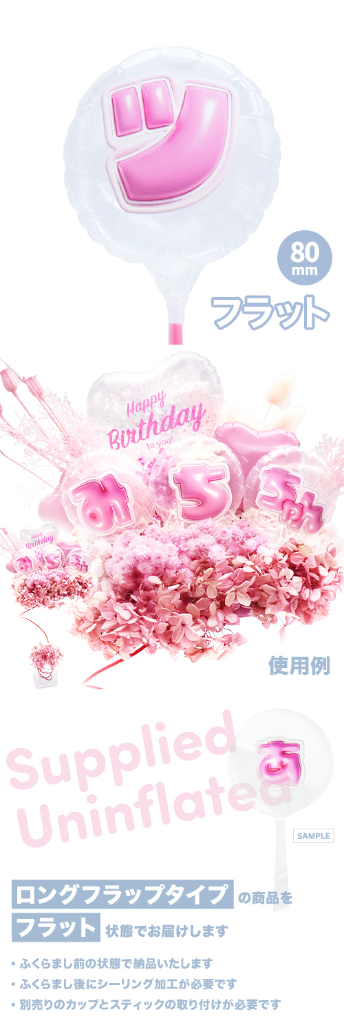 80mmラウンド 膨らまし後サイズ:W6.5×H6.5×D4cm カラーファイバースティック25cm取り付け後サイズ:W6.5×H32.8×D4cm前代未聞!キッシーズオリジナルの日本語レターバルーンです。 クリア生地にぷっくり可愛いカタカナを一文字ずつプリント。 複数の文字を組み合わせてご使用ください!