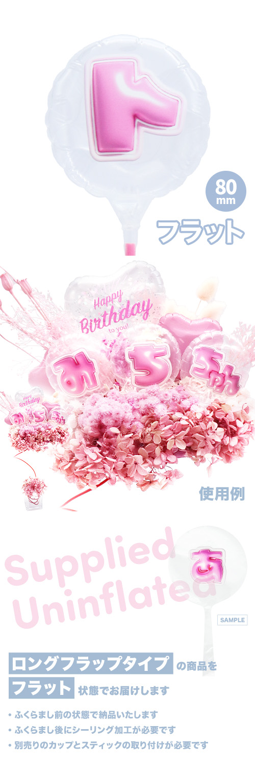 80mmラウンド 膨らまし後サイズ:W6.5×H6.5×D4cm カラーファイバースティック25cm取り付け後サイズ:W6.5×H32.8×D4cm前代未聞!キッシーズオリジナルの日本語レターバルーンです。 クリア生地にぷっくり可愛いカタカナを一文字ずつプリント。 複数の文字を組み合わせてご使用ください!