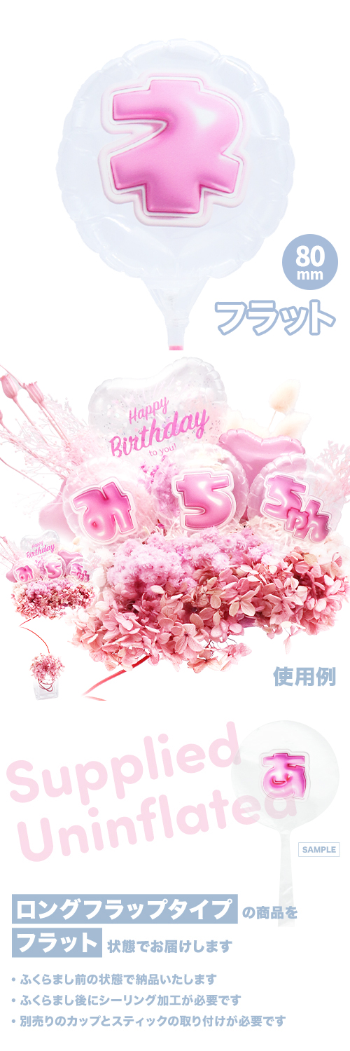 80mmラウンド 膨らまし後サイズ:W6.5×H6.5×D4cm カラーファイバースティック25cm取り付け後サイズ:W6.5×H32.8×D4cm前代未聞!キッシーズオリジナルの日本語レターバルーンです。 クリア生地にぷっくり可愛いカタカナを一文字ずつプリント。 複数の文字を組み合わせてご使用ください!