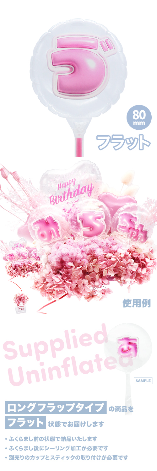 80mmラウンド 膨らまし後サイズ:W6.5×H6.5×D4cm カラーファイバースティック25cm取り付け後サイズ:W6.5×H32.8×D4cm前代未聞!キッシーズオリジナルの日本語レターバルーンです。 クリア生地にぷっくり可愛いひらがなを一文字ずつプリント。 複数の文字を組み合わせてご使用ください!