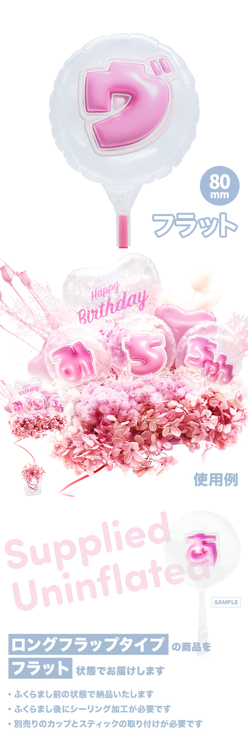 80mmラウンド 膨らまし後サイズ:W6.5×H6.5×D4cm カラーファイバースティック25cm取り付け後サイズ:W6.5×H32.8×D4cm前代未聞!キッシーズオリジナルの日本語レターバルーンです。 クリア生地にぷっくり可愛いカタカナを一文字ずつプリント。 複数の文字を組み合わせてご使用ください!