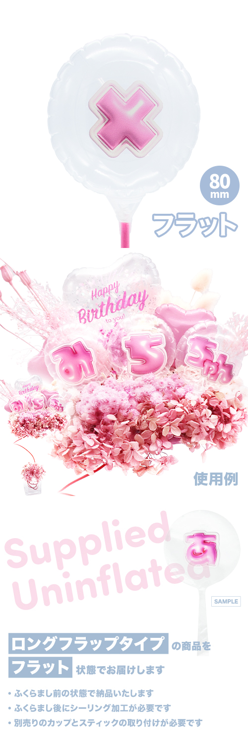 80mmラウンド 膨らまし後サイズ:W6.5×H6.5×D4cm カラーファイバースティック25cm取り付け後サイズ:W6.5×H32.8×D4cm前代未聞!キッシーズオリジナルの日本語レターバルーンです。 クリア生地にぷっくり可愛い「×」をプリント。 複数の文字を組み合わせてご使用ください!