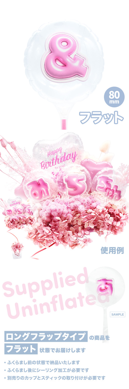 80mmラウンド 膨らまし後サイズ:W6.5×H6.5×D4cm カラーファイバースティック25cm取り付け後サイズ:W6.5×H32.8×D4cm前代未聞!キッシーズオリジナルの日本語レターバルーンです。 クリア生地にぷっくり可愛い「&」をプリント。 複数の文字を組み合わせてご使用ください!