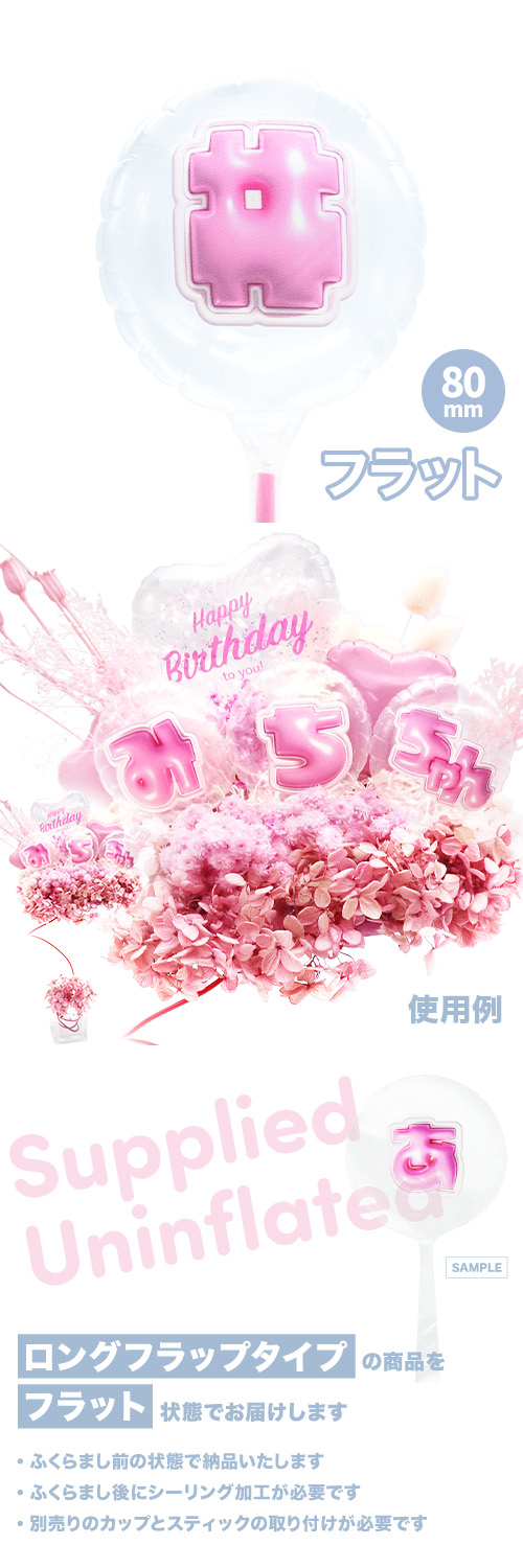 80mmラウンド 膨らまし後サイズ:W6.5×H6.5×D4cm カラーファイバースティック25cm取り付け後サイズ:W6.5×H32.8×D4cm前代未聞!キッシーズオリジナルの日本語レターバルーンです。 クリア生地にぷっくり可愛い「#」をプリント。 複数の文字を組み合わせてハッシュタグ風にご使用ください!