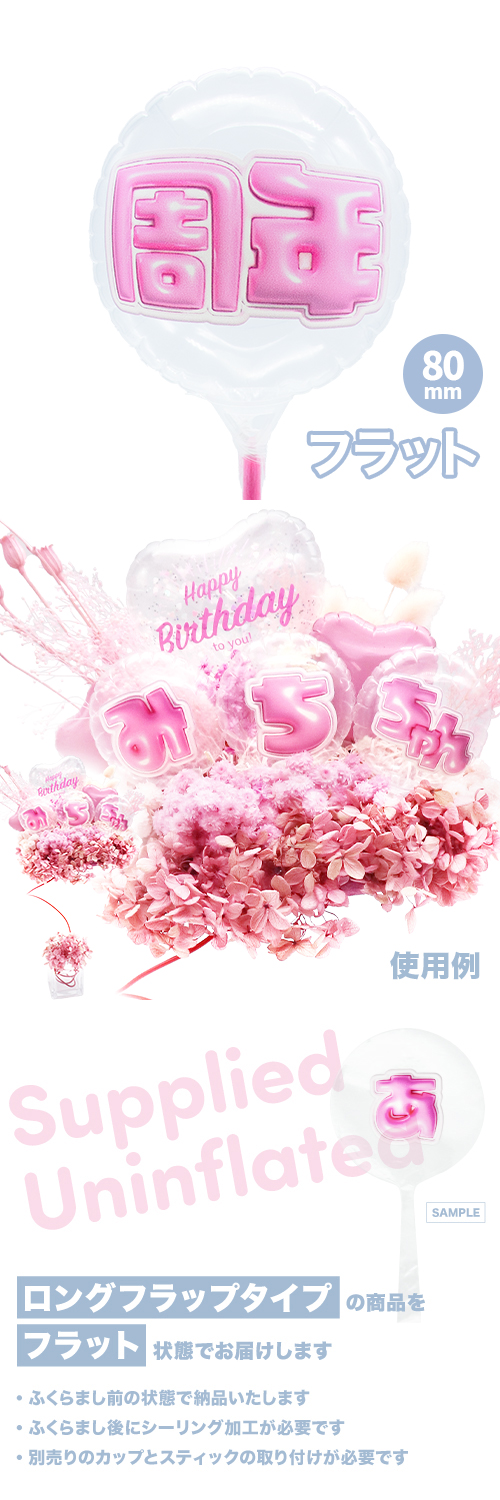 ※クリア生地・片面印刷となります。 ※フラット状態でお届けいたします。画像は吹き後イメージです。 ロングフラップ仕様となります。別途シーラー加工が必要です。 ※カップ・スティックは付属しません。 マルチタイニーカップ+25cmカラーファイバースティックの併用がおすすめです。