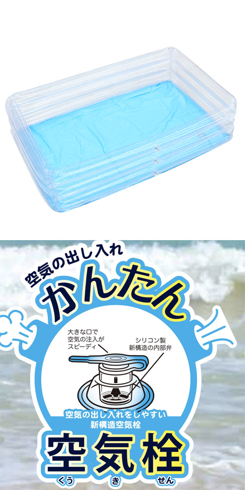 本体サイズ (外径):幅100cm×奥行65cm×高さ30cm (内径):幅90cmX奥行52cmX高さ30cm スーパーボールすくいや水ヨーヨー釣りに最適な 透明プールの角型です。 サイズも100cmあるので、同時に6〜7人で 釣ったり、すくいをしたり出来ちゃいます。 また底面は水色、側面は無色透明の生地を使用しているので、水中の商品が非常に よく映えます。素材も、安全な非フタル酸系PVCなのでお子様も安心して使えます。 縁日すくい・イベントにオススメですよ。 <保護者の方へ> 〜素材について〜 旧来のビニール製品にはフタル酸が使用され 環境ホルモンによる人体への影響が 懸念されています。 幼児向けの玩具などを中心に 安全な「非フタル酸」(フタル酸を使用しない物) に切り替わっています。 当店では玩具はもちろんの事、イベント用プールも 「非フタル酸」にて製造しております。 小さなお子様が直接触れるものですので 少し価格は上がってしまいますが 安全なものをご提供しております。空気の出し入れが簡単な空気栓です。