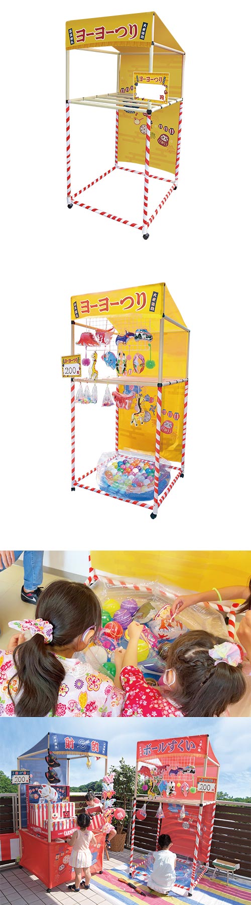 「お祭り問屋の岸ゴムの縁日ノ屋台」は意匠登録済みです。(登録意匠第1742768号) 商品サイズ:W90×H188×D90cm(組み立て後) 梱包サイズ:W41.5×H12×D102.5cmセット内容:紙管・ジョイントパーツ・キャスター 1セット、 紅白テープ 1巻、屋根 1枚、 ラミネート値段カード 1枚、マジックテープ予備 ※本商品は屋内用紙管製屋台組み立てキットです。紙管の劣化や屋台の転倒を防ぐため、雨風には曝さないでください。 プールや玩具、景品は別売りです。 お祭りロスに悩める日本。小規模のお祭りを開きたいけれど本物の屋台を準備するのは大変、そこまでコストをかけられない…そんなあなたに「お祭り問屋の岸ゴムの縁日ノ屋台」! 紙管製で低価格・軽量化を実現。お求めやすく簡単に組み立てたり持ち運んだりできる夢の屋台です。 別売りのおもちゃやお菓子、景品をセットすれば、あっという間に本格的な縁日屋台のできあがり! さまざまなあそびの屋台をずらりと並べれば、お祭りのあの高揚感が蘇ります。 カーニバルゲームボックスや直径80cmのプールを置くのに適した構造です。組み立て方によって使い分けられます。 オプションの天板用プラダンを使用すれば他の物を置くこともできます(極端に重いものは乗せないでください)。 他のあそびの屋根や腰巻も単品でお求めいただけます。