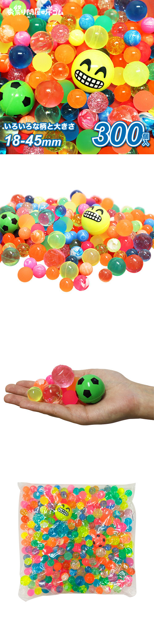 | 18mm×180個、22mm×90個、27mm×25個、32mm×3個、38mm×1個、45mm×1個お得なケース特価!小さめスーパーボールが多めの、お買い得アソートセット。様々なサイズで300個入り♪単価重視のイベントにおススメです! |